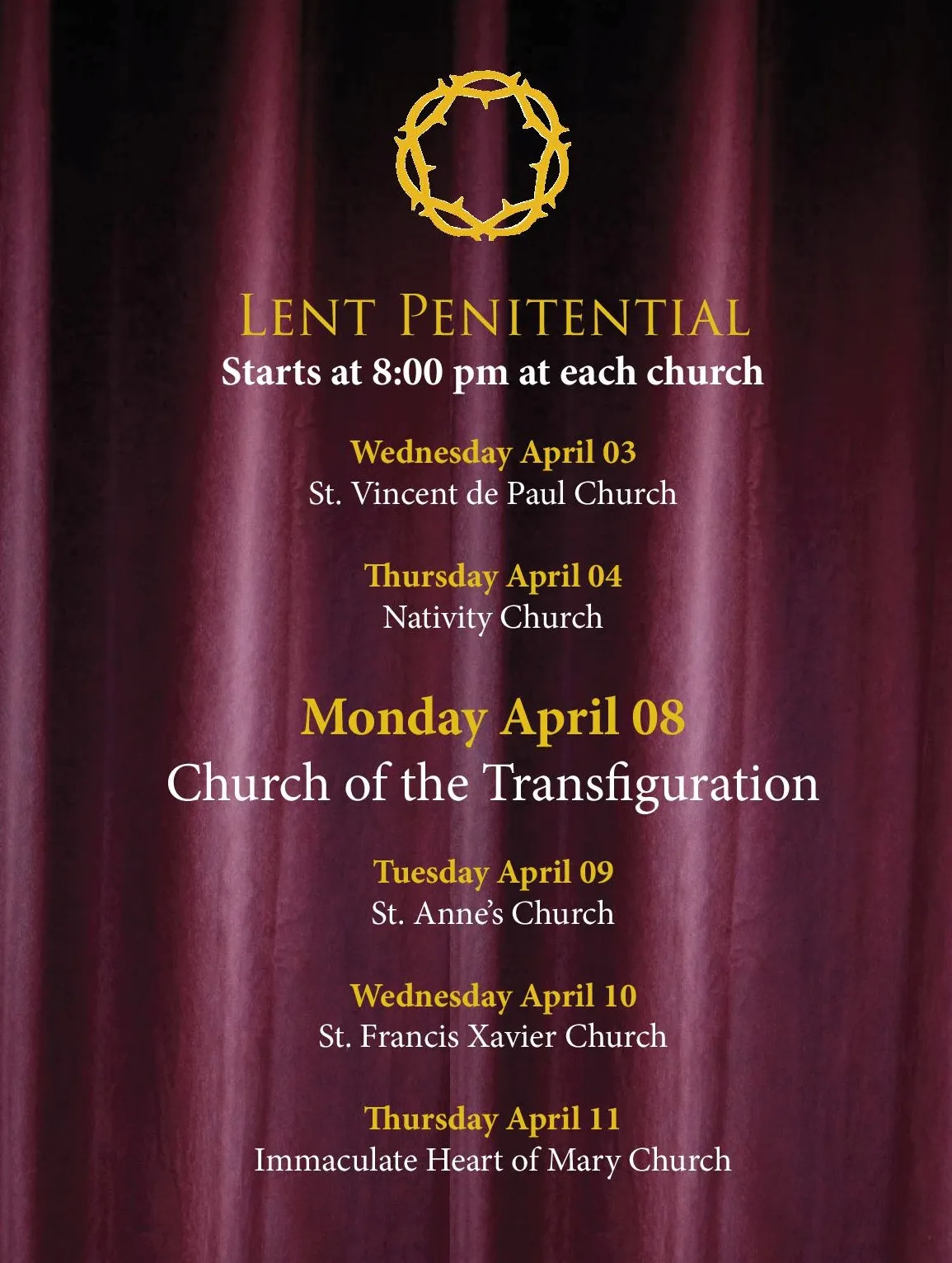 3apr - 11apr 38:00 pmapr 112019 Lent Penitential Services8:00 pm - 8:00 pm (11)