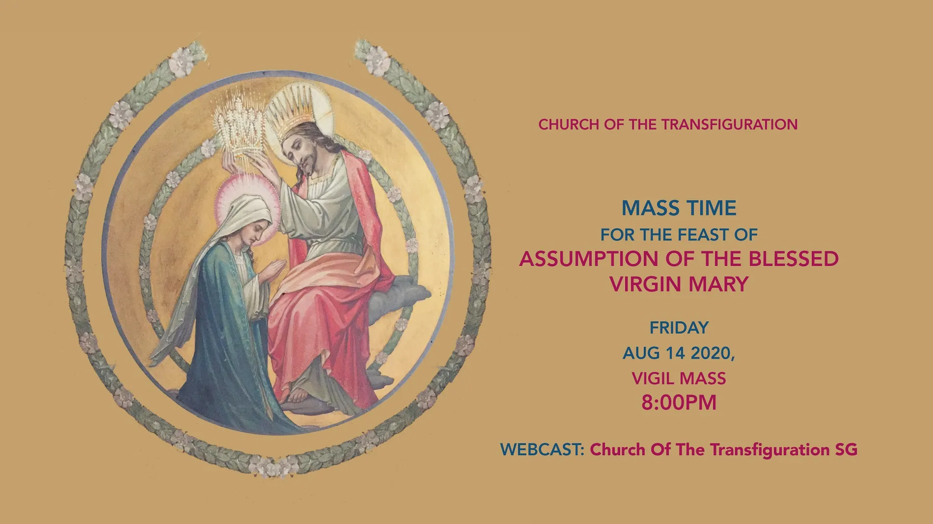 august, 2020 Assumption of the Blessed Virgin Mary 2020 14aug8:00 pm- 9:00 pmAssumption of the Blessed Virgin Mary 20208:00 pm - 9:00 pm Event DetailsClick here to view the webcast. Event Details Click here to view the webcast. Time(Friday) 8:00 pm - 9:00 pm CalendarGoogleCal