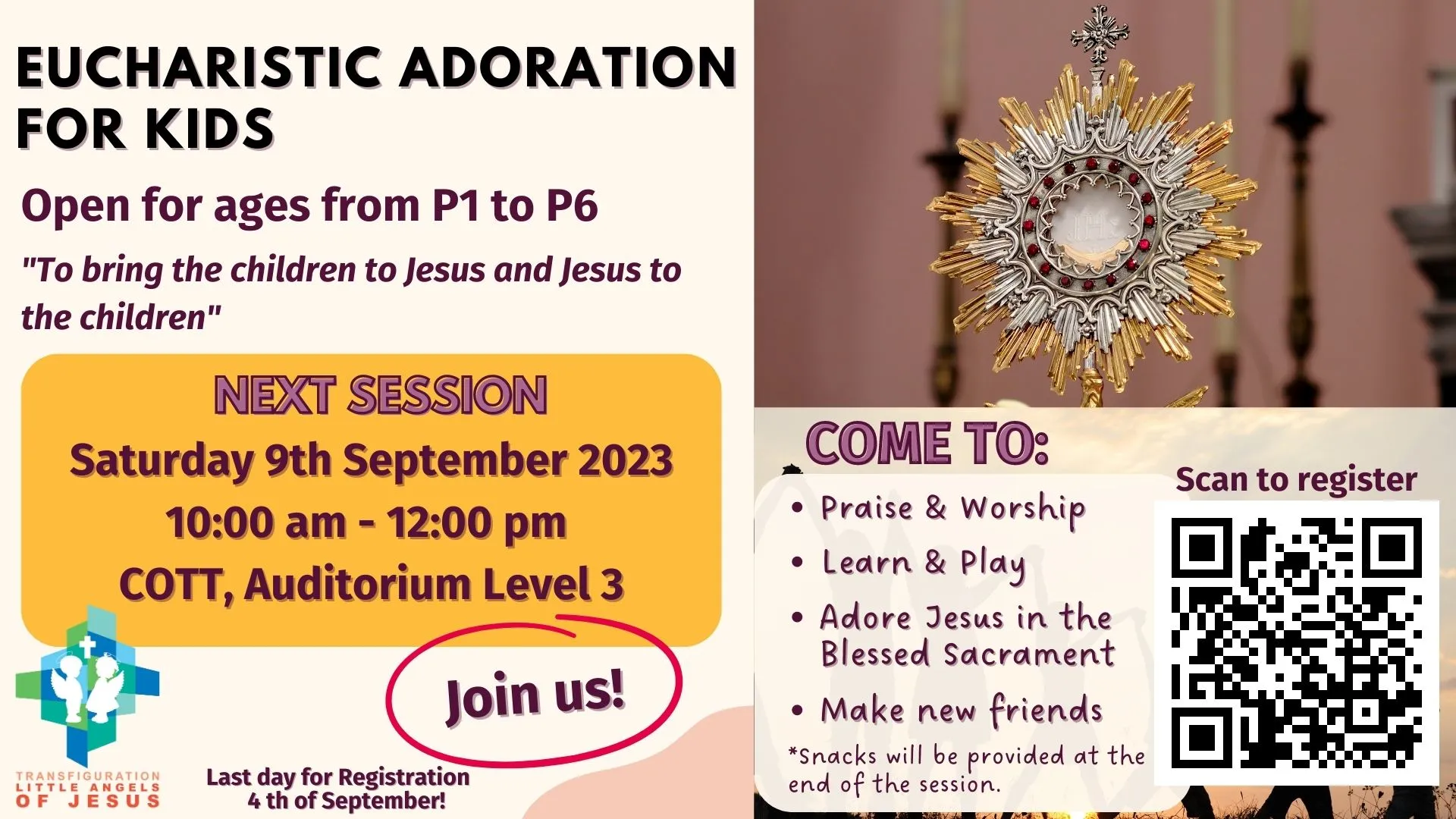 The Little Angels of Jesus’ Ministry invites all children from P1 to P6 to Eucharistic Adoration, every second Saturday of the month from 10am to 12pm at the Parish Auditorium, Level 3.
