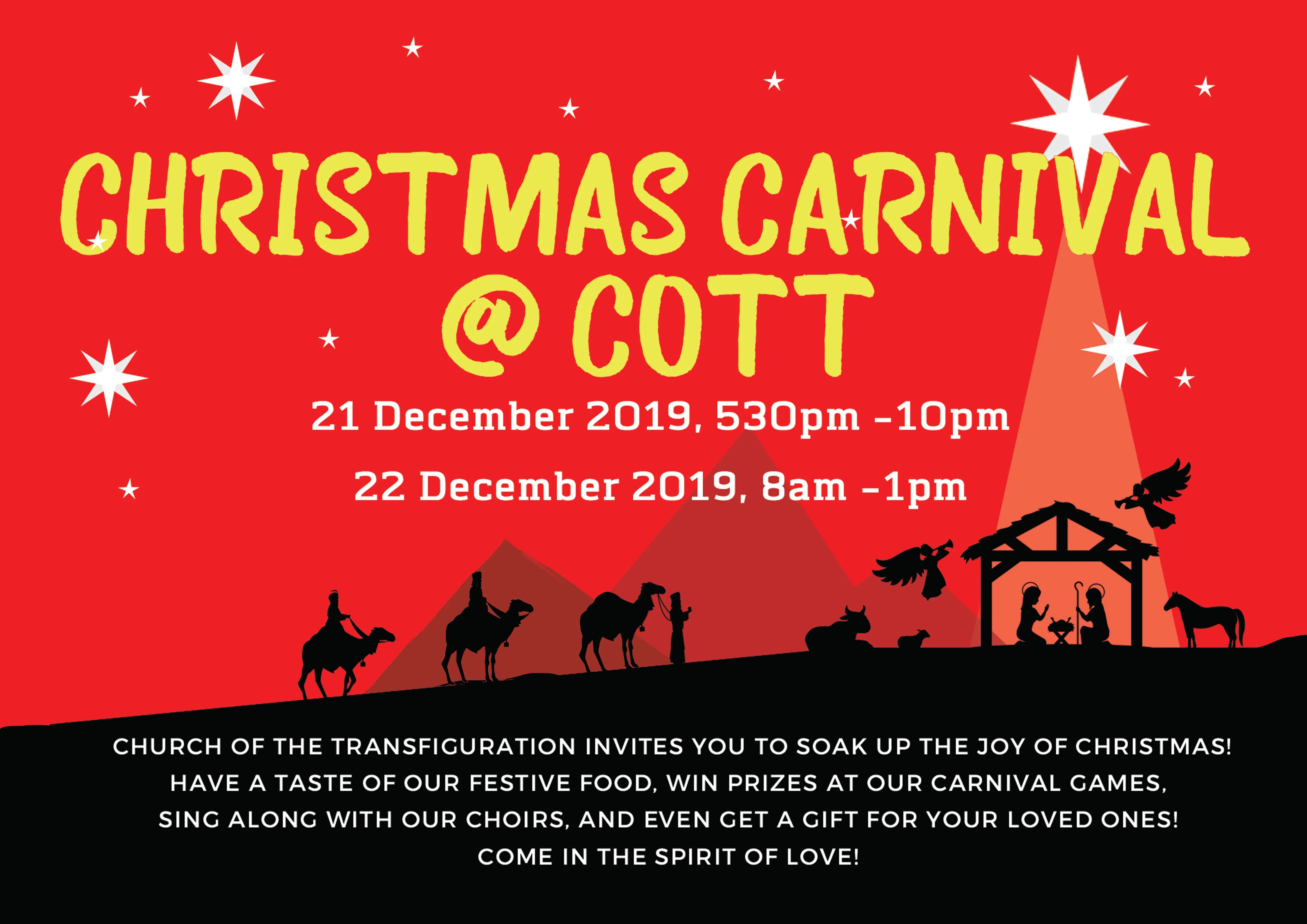 december, 2019 Christmas Carnival at COTT 21dec - 22dec 215:30 pmdec 22Christmas Carnival at COTT5:30 pm - 1:00 pm (22) Time21 (Saturday) 5:30 pm - 22 (Sunday) 1:00 pm CalendarGoogleCal