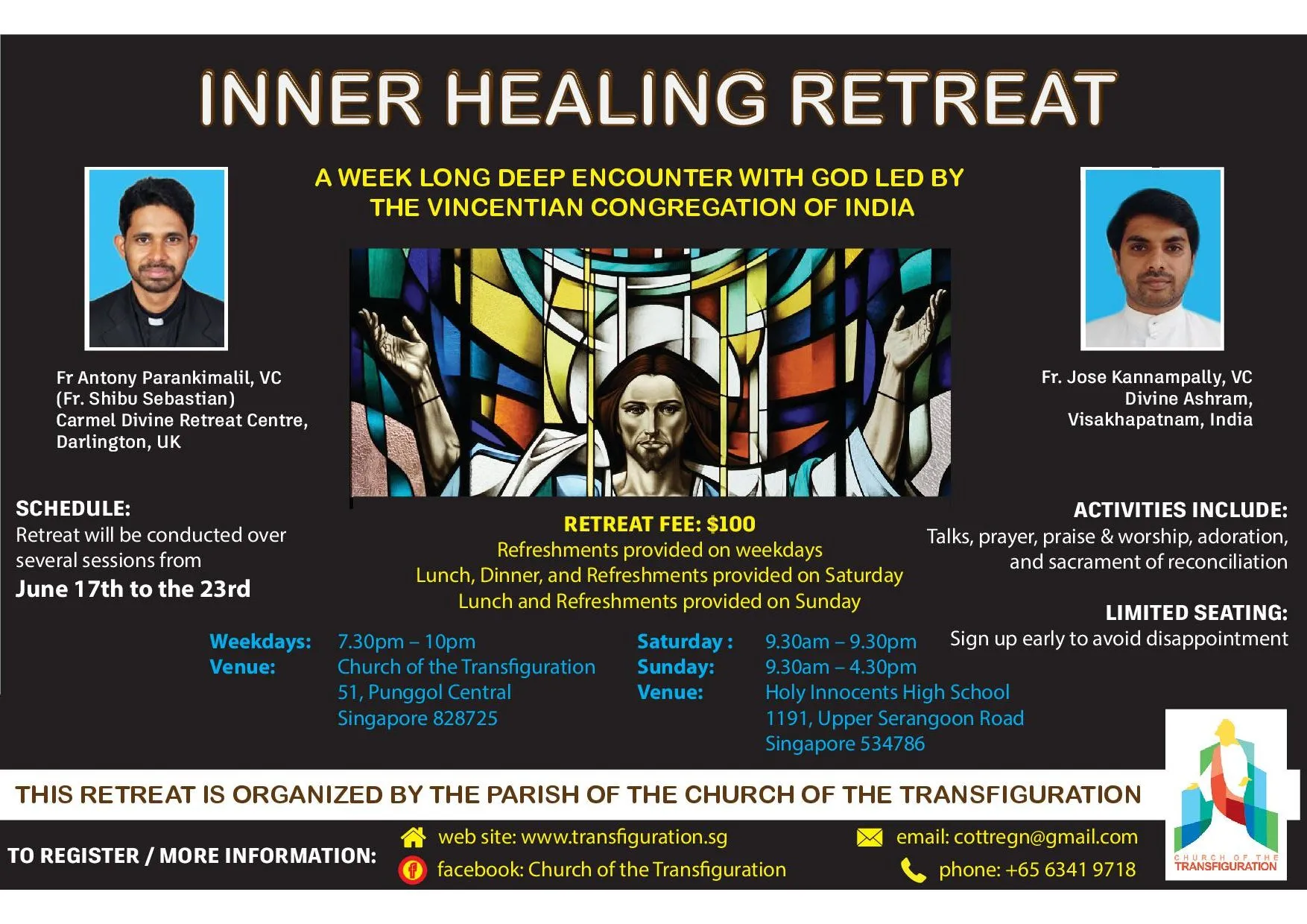 june, 2019 Inner Healing Retreat 2019 17jun - 23jun 177:30 pmjun 23Inner Healing Retreat 20197:30 pm - 4:30 pm (23) Event Details For registration, please click here to download the registration form and submit it to Parish Office. You may contact the Parish Office at Event Details For registration, please click here to download the registration form and submit it to Parish Office. You may contact the Parish Office at 6341 9718. Time17 (Monday) 7:30 pm - 23 (Sunday) 4:30 pm CalendarGoogleCal