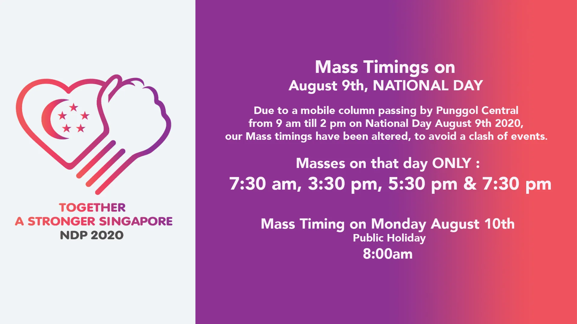 9aug - 10aug 97:30 amaug 10National Day - 9 August 20207:30 am - 8:00 am (10)